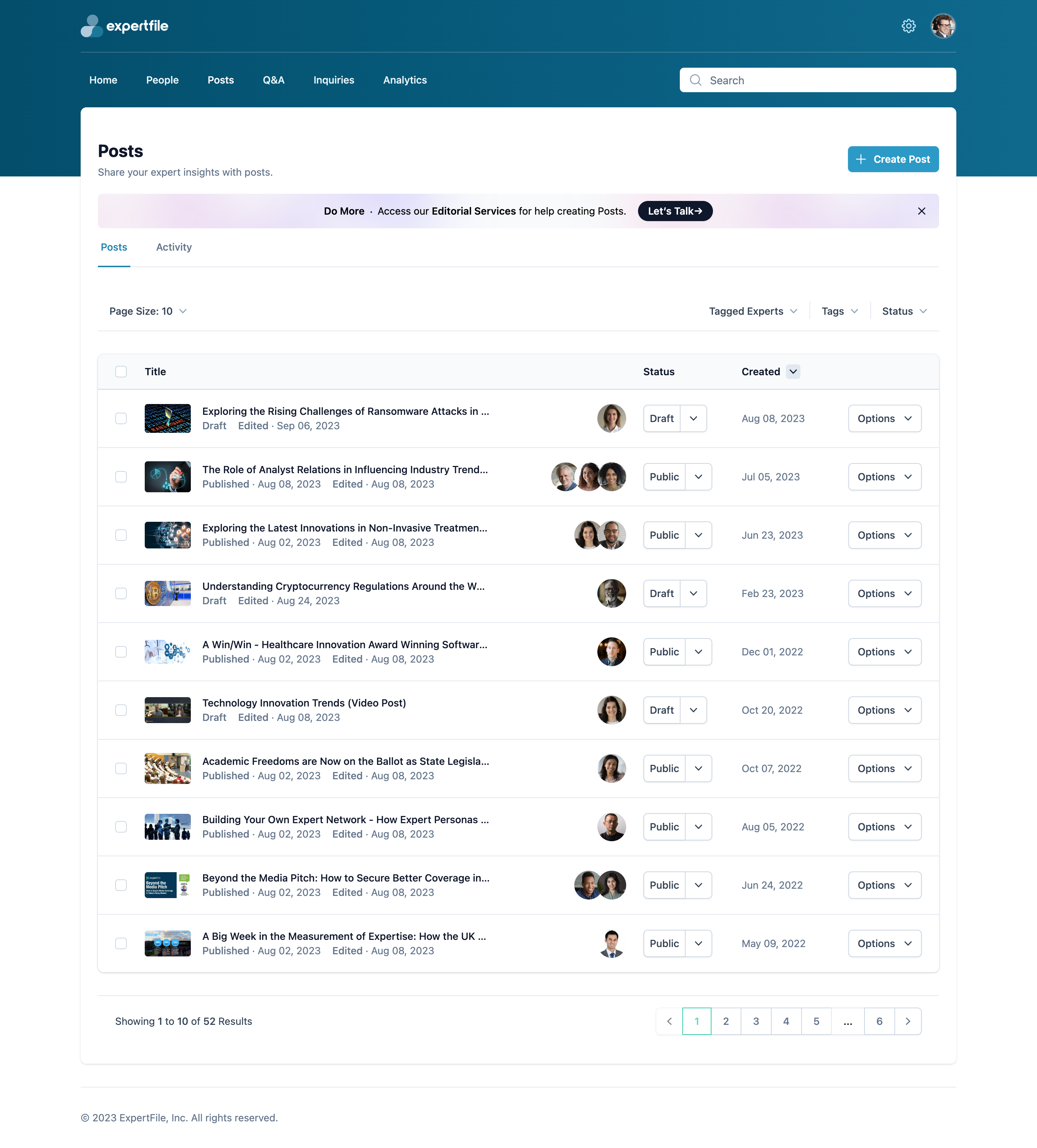The "Posts" tab is the starting point for sharing your organization’s insights on current news, trending topics and more by creating shareable Posts that connect back to your experts. Interactive and mobile-ready, Posts let you quickly deliver expert, SEO friendly content to your audiences on any device at any time. Quick links allow you to create drafts including using our new AI Brainstorming feature to help generate ideas and initial drafts. For more interaction with your expert Posts streamline content discovery and expand your content distribution capabilities by tagging your Posts. Whether you choose to publish immediately or schedule for future release, you have the flexibility to align your content with breaking news, important announcements, cyclical trends or your marketing calendar. Finally increase the power of Posts by assigning individual experts to each post to better connect your insights to your experts, driving more profiles views and valuable inquiries.